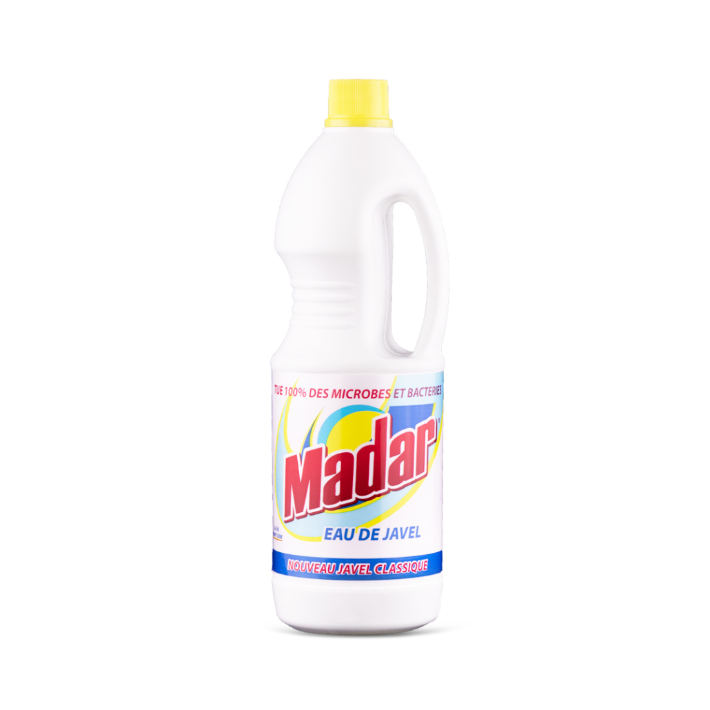 L’EAU DE JAVEL Madar ou Noura 2.5% à 3.3% (8° à 10° Chlorométrique) est une solution liquide jaunâtre. Elle élimine les saletés les plus tenaces et toutes sortes de microbes qui peuvent être dangereux pour la santé en laissant une odeur agréable. L’EAU DE JAVEL Madar ou Noura désinfecte, détache, blanchie et peut être utilisé partout : cuisines, salles de bains, toilettes, poubelles, sols, carrelages, en milieu hospi- talier, vétérinaire, en restauration (légumes, fruits, locaux, ustensiles), textiles, traitement des eaux de piscine etc.